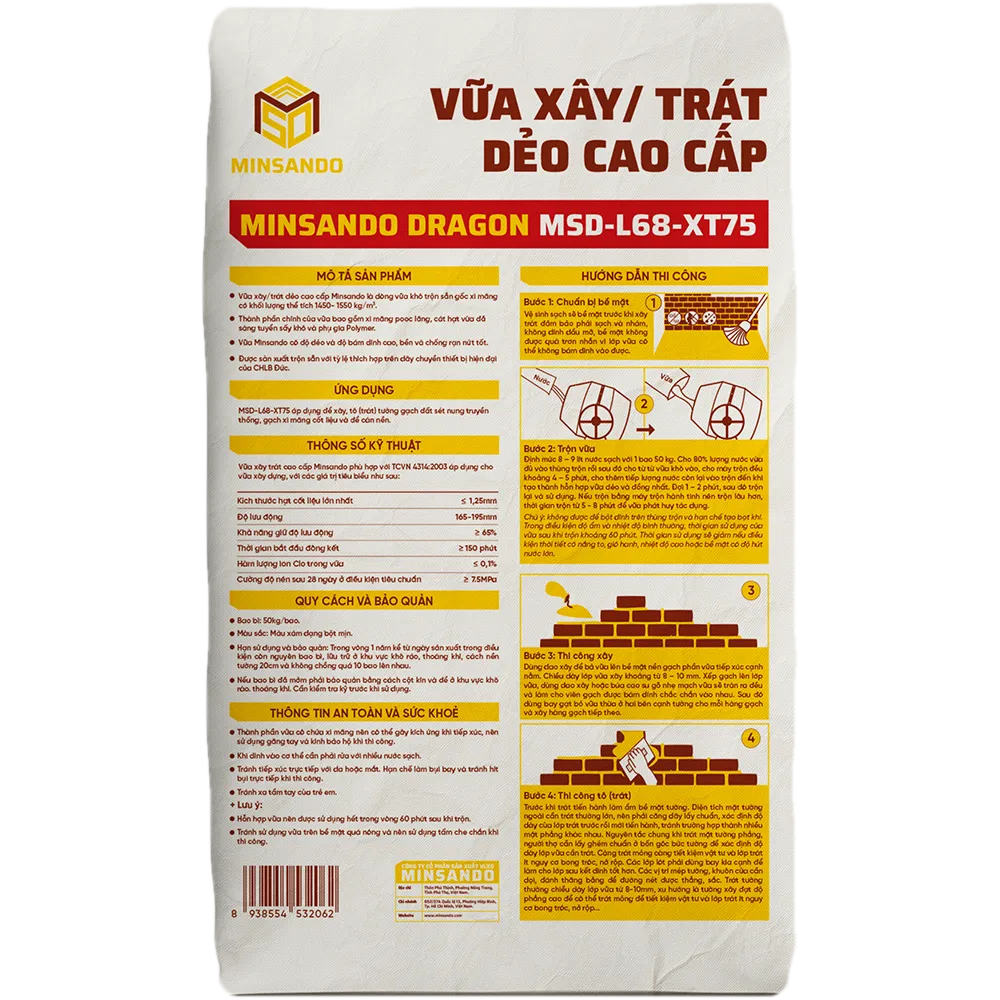 – Vữa xây/trát dẻo cao cấp Minsando Dragon MSD-L68-XT75 có độ dẻo và độ bám dính cao, bền và chống rạn nứt tốt.- Được sản xuất trộn sẵn với tỷ lệ thích hợp trên dây chuyền thiết bị hiện đại của CHLB Đức.